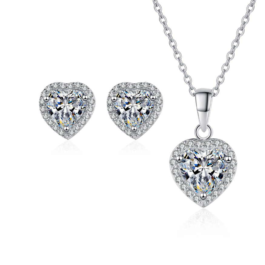 Heart-Shaped Halo 0.5 / 1 Carat Moissanite 3-Piece S925 Jewelry Set (Stud Earrings and Necklace)