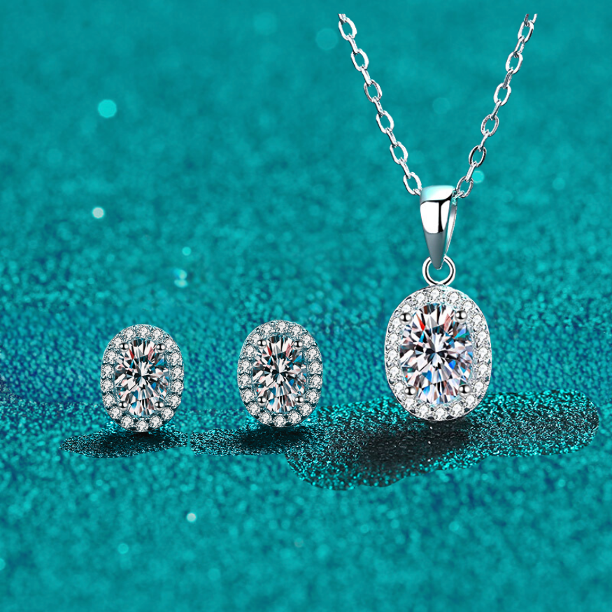 Indulge in the eternal glamour of our Oval Cut Halo 0.5/1 Carat Moissanite 3-Piece S925 Jewelry Set. Featuring a timeless oval cut Moissanite stone, this set includes a pair of stud earrings and a necklace. Elevate any outfit with this never out-of-date style, and exude sophistication and elegance with every wear.