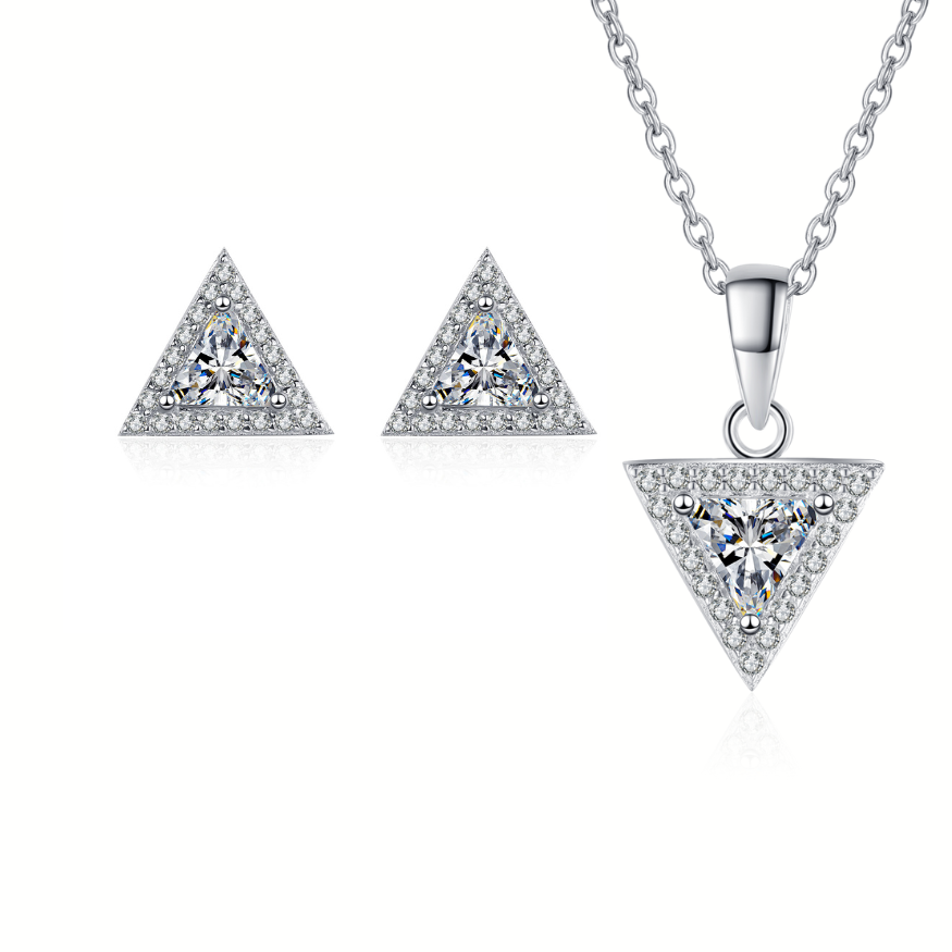 Sparkle and shine with this 3-piece set featuring a stunning trillion cut halo moissanite pendant and matching earrings. These S925 pieces will make a lasting impression. Perfect for any occasion, bring some whimsy to your style with this playful set.