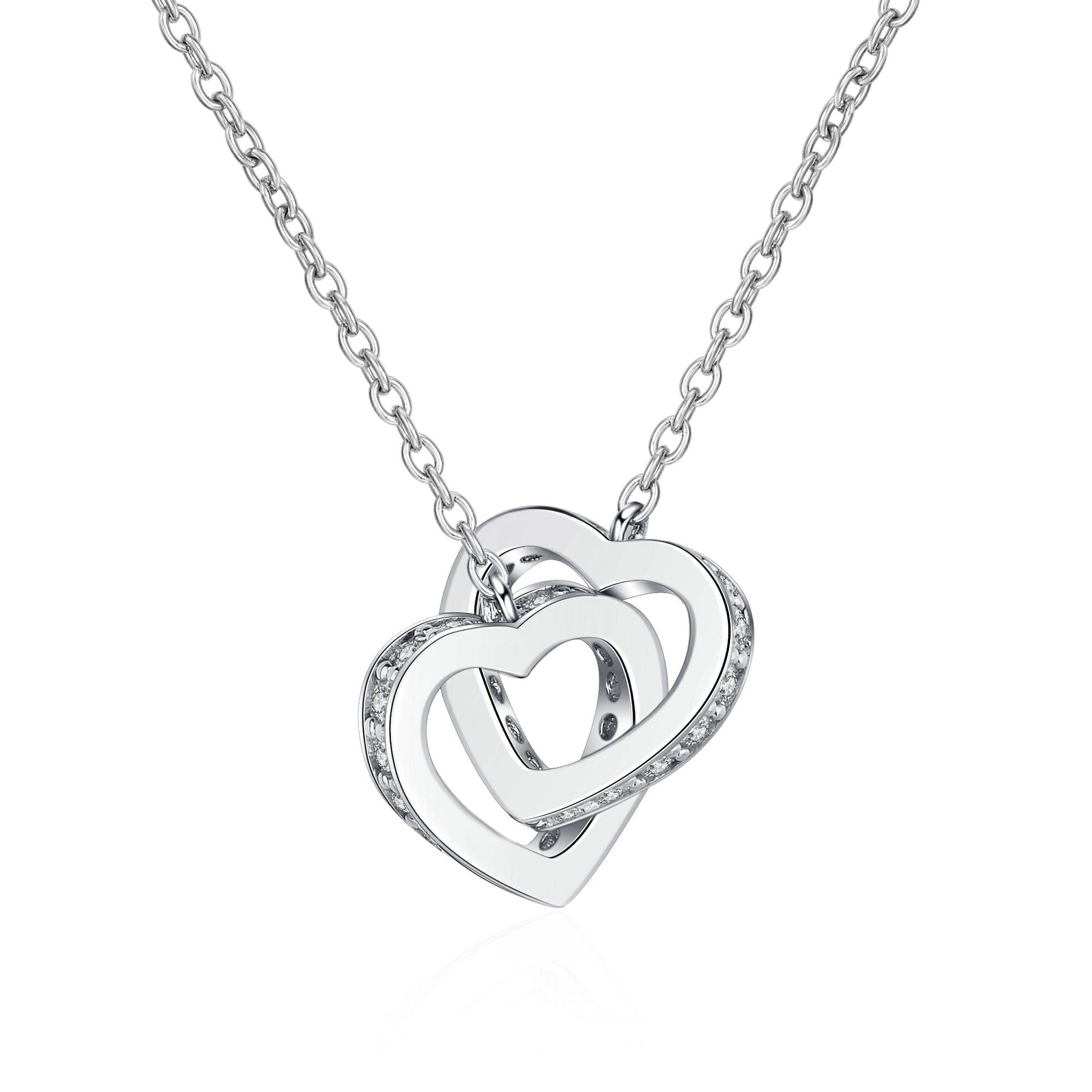 This stunning Interlocking Hearts Necklace features two exquisite hearts, symbolizing love and devotion, in a breathtaking design. The VVS Moissanite is set in a sterling silver necklace, making this an elegant piece of jewelry that any woman would cherish forever.