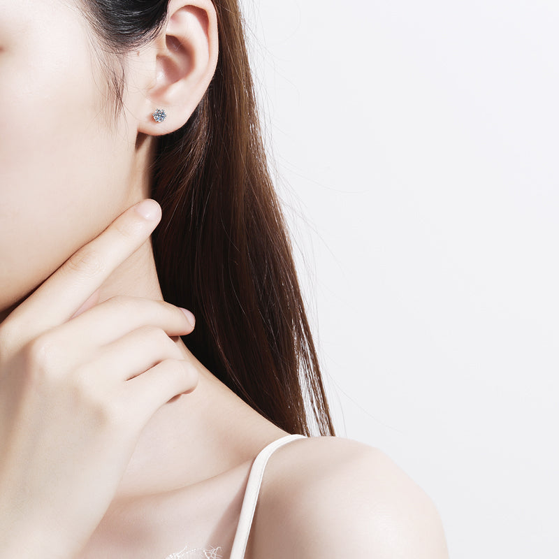 These snowflake-shaped 6-Heart-Prong Round Cut stud earrings are crafted from S925 sterling silver and available in 5 high-grade Moissanite sizes (0.3ct, 0.5ct, 1.0ct, 1.5ct, and 2.0ct) with D-color and VVS clarity. Perfect for minimalist looks, they always stay in style and are sure to dazzle.