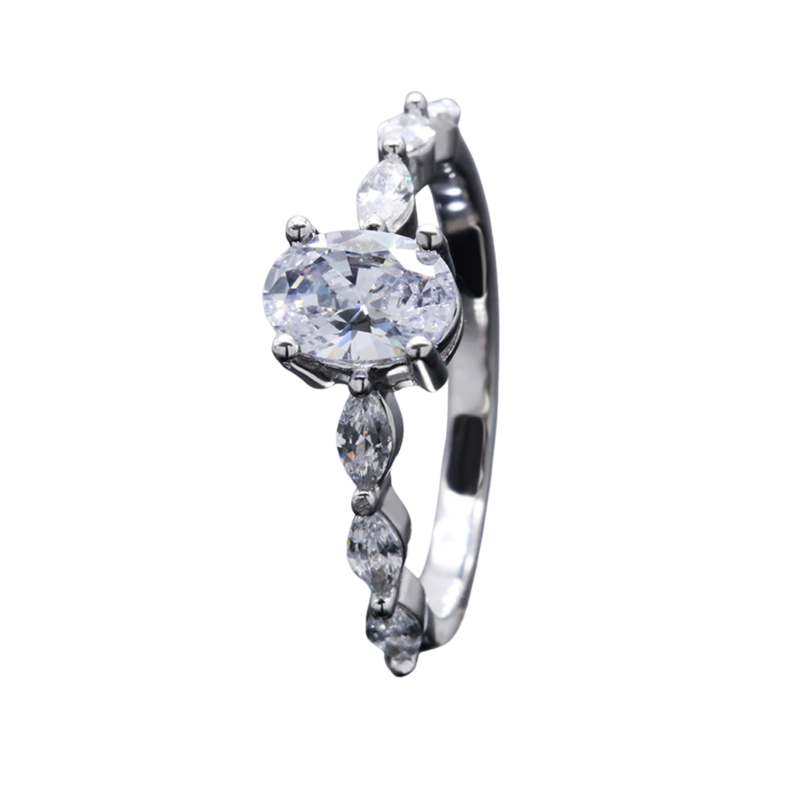 Six Marquise Side Stones compose the shank and set the stage for the central Oval Cut Moissanite of your choice of color. The shape of the Marquise symbolizes ladies' beautiful lips, making the shank stylish and romantic. The Marquise shape also represents royalty as it is developed regarding the Marquise of Pompadour. This 1-carat Moissanite ring is impressive and ideal as an Engagement Ring. Order this Moissanite Ring at the best price and please your beloved on a particular day.