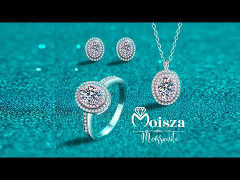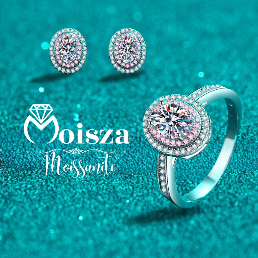 Indulge in the perfect bridal set or gift with our Oval Cut Pink Double Halo 0.5 / 1 Carat Moissanite 4-Piece S925 Jewelry Set! With a stunning oval cut stone and a double halo design, this set is sure to catch everyone's eye. Save a hundred dollars and complete your look with our matching ring, earrings, and necklace. Rock your style and confidence with our fab set!