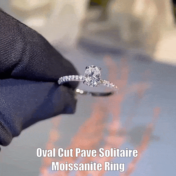 Turn heads with our Oval Cut Pave Solitaire Moissanite Ring—an elegant and striking choice for an engagement. The sparkling pave setting enhances the brilliance of the 1 or 2 carat center stone, while the elongated oval cut offers a larger, more refined look. Loved for its unique charm and rising popularity, this ring is the perfect way to surprise your beloved at an unbeatable price.