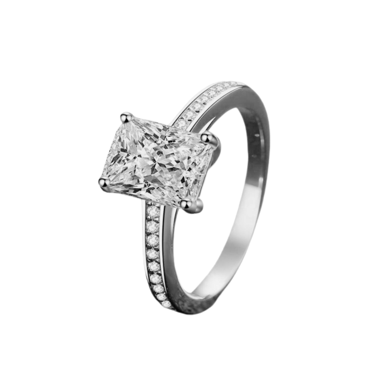 This Emerald/Radiant Cut Moissanite ring is dazzling and popular as an engagement ring. It is an outstanding and eye-catching choice, with the elegant channel band flashing to enhance the center solitaire. Order this stylish Moissanite Ring at the best price and fill your beloved with ecstatic happiness.